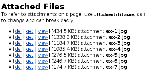Do not use the URL of the [get] link you can see on the attachments upload page, since these links are subject to change and can break easily on reconfiguration of the wiki. To refer to files attached to other pages, use attachment:WikiName/filename.ext.